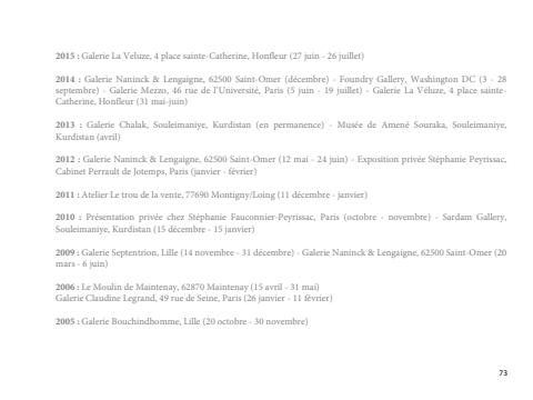 2015 : Galerie La Veluze, 4 place sainte-Catherine, Honfleur (27 juin - 26 juillet)2014 : Galerie Naninck & Lengaigne, 62500 Saint-Omer (d%u00e9cembre) - Foundry Gallery, Washington DC (3 - 28 septembre) - Galerie Mezzo, 46 rue de l%u2019Universit%u00e9, Paris (5 juin - 19 juillet) - Galerie La V%u00e9luze, 4 place sainteCatherine, Honfleur (31 mai-juin)2013 : Galerie Chalak, Souleimaniye, Kurdistan (en permanence) - Mus%u00e9e de Amen%u00e9 Souraka, Souleimaniye, Kurdistan (avril)2012 : Galerie Naninck & Lengaigne, 62500 Saint-Omer (12 mai - 24 juin) - Exposition priv%u00e9e St%u00e9phanie Peyrissac, Cabinet Perrault de Jotemps, Paris (janvier - f%u00e9vrier)2011 : Atelier Le trou de la vente, 77690 Montigny/Loing (11 d%u00e9cembre - janvier)2010 : Pr%u00e9sentation priv%u00e9e chez St%u00e9phanie Fauconnier-Peyrissac, Paris (octobre - novembre) - Sardam Gallery, Souleimaniye, Kurdistan (15 d%u00e9cembre - 15 janvier)2009 : Galerie Septentrion, Lille (14 novembre - 31 d%u00e9cembre) - Galerie Naninck & Lengaigne, 62500 Saint-Omer (20 mars - 6 juin)2006 : Le Moulin de Maintenay, 62870 Maintenay (15 avril - 31 mai)Galerie Claudine Legrand, 49 rue de Seine, Paris (26 janvier - 11 f%u00e9vrier)2005 : Galerie Bouchindhomme, Lille (20 octobre - 30 novembre)73