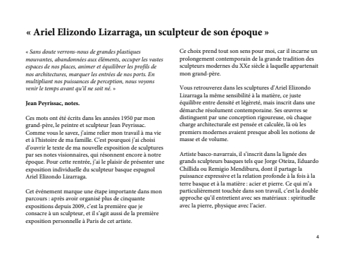 4%u00ab Ariel Elizondo Lizarraga, un sculpteur de son %u00e9poque %u00bb%u00ab Sans doute verrons-nous de grandes plastiques mouvantes, abandonn%u00e9es aux %u00e9l%u00e9ments, occuper les vastes espaces de nos places, animer et %u00e9quilibrer les profils de nos architectures, marquer les entr%u00e9es de nos ports. En multipliant nos puissances de perception, nous voyons venir le temps avant qu%u2019il ne soit n%u00e9. %u00bbJean Peyrissac, notes.Ces mots ont %u00e9t%u00e9 %u00e9crits dans les ann%u00e9es 1950 par mon grand-p%u00e8re, le peintre et sculpteur Jean Peyrissac. Comme vous le savez, j%u2019aime relier mon travail %u00e0 ma vie et %u00e0 l%u2019histoire de ma famille. C%u2019est pourquoi j%u2019ai choisi d%u2019ouvrir le texte de ma nouvelle exposition de sculptures par ses notes visionnaires, qui r%u00e9sonnent encore %u00e0 notre %u00e9poque. Pour cette rentr%u00e9e, j%u2019ai le plaisir de pr%u00e9senter une exposition individuelle du sculpteur basque espagnol Ariel Elizondo Lizarraga.Cet %u00e9v%u00e9nement marque une %u00e9tape importante dans mon parcours : apr%u00e8s avoir organis%u00e9 plus de cinquante expositions depuis 2009, c%u2019est la premi%u00e8re que je consacre %u00e0 un sculpteur, et il s%u2019agit aussi de la premi%u00e8re exposition personnelle %u00e0 Paris de cet artiste. Ce choix prend tout son sens pour moi, car il incarne un prolongement contemporain de la grande tradition des sculpteurs modernes du XXe si%u00e8cle %u00e0 laquelle appartenait mon grand-p%u00e8re.Vous retrouverez dans les sculptures d%u2019Ariel Elizondo Lizarraga la m%u00eame sensibilit%u00e9 %u00e0 la mati%u00e8re, ce juste %u00e9quilibre entre densit%u00e9 et l%u00e9g%u00e8ret%u00e9, mais inscrit dans une d%u00e9marche r%u00e9solument contemporaine. Ses %u0153uvres se distinguent par une conception rigoureuse, o%u00f9 chaque charge architecturale est pens%u00e9e et calcul%u00e9e, l%u00e0 o%u00f9 les premiers modernes avaient presque aboli les notions de masse et de volume.Artiste basco-navarrais, il s%u2019inscrit dans la lign%u00e9e des grands sculpteurs basques tels que Jorge Oteiza, Eduardo Chillida ou Remigio Mendiburu, dont il partage la puissance expressive et la relation profonde %u00e0 la fois %u00e0 la terre basque et %u00e0 la mati%u00e8re : acier et pierre. Ce qui m%u2019a particuli%u00e8rement touch%u00e9e dans son travail, c%u2019est la double approche qu%u2019il entretient avec ses mat%u00e9riaux : spirituelle avec la pierre, physique avec l%u2019acier.