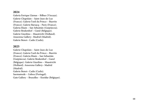 2024Galer%u00eda Enrique Llamas %u2013 Bilbao (Vizcaya).Galerie Chapelain %u2013 Saint-Jean-de-Luz (France). Galerie l%u2019oeil du Prince %u2013 Biarritz (France). Galerie Barsacq %u2013 Paris (France).Galeria Ekain %u2013 San Sebasti%u00e1n (Guip%u00fazcoa).Galerie Beukenhof %u2013 Gand (Belgique).Galerie Giardino %u2013 Maastricht (Holland).Ansorena Gallery%u2013 Madrid (Madrid).Galerie Benot%u2013 Cadiz (Cadiz).2025Galerie Chapelain %u2013 Saint-Jean-de-Luz (France). Galerie l%u2019oeil du Prince %u2013 Biarritz (France). Galeria Ekain %u2013 San Sebasti%u00e1n (Guip%u00fazcoa). Galerie Beukenhof %u2013 Gand (Belgique). Galerie Giardino %u2013 Maastricht (Holland). Ansorena Gallery%u2013 Madrid (Madrid).Galerie Benot%u2013 Cadiz (Cadiz).Saomamede %u2013 Lisboa (Portugal).Gate Gallery %u2013 Bruxelles %u2013 Knokke (Belgique).68