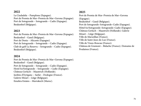 712022La Ciudadela %u2013 Pamplona (Espagne).Port de Premia de Mar%u2013Premia de Mar%u2013Gerona (Espagne).Port de Sotogrande %u2013 Sotogrande %u2013 Cadiz (Espagne).Beukenhof (Belgique).2023Port de Premia de Mar%u2013Premia de Mar%u2013Gerona (Espagne).Beukenhof %u2013 Gand (Belgique).Port de Denia %u2013 Alicante (Espagne).Port de Sotogrande %u2013 Sotogrande %u2013 Cadiz (Espagne).Club de golf La Reserva %u2013 Sotogrande %u2013 Cadiz (Espagne).Beukenhof (Belgique).2024Port de Premia de Mar%u2013Premia de Mar%u2013Gerona (Espagne).Beukenhof %u2013 Gand (Belgique).Port de Sotogrande %u2013 Sotogrande %u2013 Cadiz (Espagne).Hotel So/Sotogrande %u2013 Sotogrande %u2013 Cadiz (Espagne).Ch%u00e2teau Gerlach %u2013 Maastrich (Hollande).Jardins d%u2019Eyriganc %u2013 Sarlat %u2013 Dodogne (France).Galerie Mizart %u2013 Li%u00e8ge (Belgique).Ezzahra Estates %u2013 Marrakech (Maroc).2025Port de Premia de Mar%u2013Premia de Mar%u2013Gerona (Espagne).Beukenhof %u2013 Gand (Belgique).Port de Sotogrande%u2013Sotogrande%u2013Cadiz (Espagne).H%u00f4tel So/Sotogrande%u2013Sotogrande%u2013Cadiz (Espagne).Ch%u00e2teau Gerlach %u2013 Maastrich (Hollande). Galerie Mizart %u2013 Li%u00e8ge (Belgique).Ville de Marseillan (France).Ville de Saint-Jean-de-Luz (France).Ville de Vieux-Boucau (France).Ch%u00e2teau de Gramont %u2013 Bidache (France). Domaine de Poulaines (France).