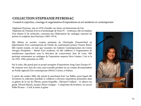COLLECTION STEPHANIE PEYRISSACConseil et expertise, courtage et organisation d%u2019expositions en art moderne et contemporainSt%u00e9phanie Peyrissac, n%u00e9e en 1970 %u00e0 Neuilly-sur-Seine, est historienne de l%u2019art.Dipl%u00f4m%u00e9e de l%u2019Institut d%u2019art et d%u2019arch%u00e9ologie de Paris IV %u2013 Sorbonne, elle est titulaire d%u2019un Master II de recherche, couronn%u00e9 par l%u2019%u00e9laboration du catalogue raisonn%u00e9 du peintre et sculpteur Jean Peyrissac (1895%u20131974).Elle d%u00e9bute sa carri%u00e8re comme assistante de Christophe Durand-Ruel au d%u00e9partement d%u2019art contemporain de l%u2019%u00e9tude du commissaire-priseur Francis Briest. Elle rejoint ensuite, en tant que vacataire, les Galeries Contemporaines du Centre Georges Pompidou %u2013 Mus%u00e9e d%u2019art moderne, o%u00f9 elle collabore %u00e0 l%u2019organisation de nombreuses expositions sous la direction du conservateur Jean de Loisy. Elle participe notamment au catalogue de l%u2019exposition majeure Hors Limites. L%u2019art et la vie 1952%u20131994, pr%u00e9sent%u00e9e en 1994.Par la suite, elle prend part au projet europ%u00e9en d%u2019expositions Song Lines Europe 97%u201398, toujours avec Jean de Loisy, puis travaille pendant un an comme documentaliste au Fonds r%u00e9gional d%u2019art contemporain (FRAC) Centre, %u00e0 Orl%u00e9ans.%u00c0 partir des ann%u00e9es 2000, elle rejoint le marchand d%u2019art Luc Bellier, pour lequel elle inventorie la collection familiale et collabore %u00e0 diverses expositions pr%u00e9sent%u00e9es dans sa galerie de la rue de l%u2019%u00c9lys%u00e9e, parmi lesquelles : %u00c9douard Vuillard %u2013 Le silence me garde, Edvard Munch, Jacques-Henri Lartigue %u2013 L%u2019empreinte du bonheur, ou encore Pablo Picasso %u2013 L%u2019%u0153il, la main, le g%u00e9nie.75