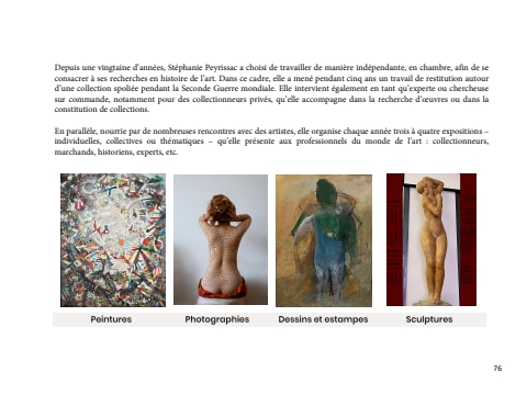 76Depuis une vingtaine d%u2019ann%u00e9es, St%u00e9phanie Peyrissac a choisi de travailler de mani%u00e8re ind%u00e9pendante, en chambre, afin de se consacrer %u00e0 ses recherches en histoire de l%u2019art. Dans ce cadre, elle a men%u00e9 pendant cinq ans un travail de restitution autour d%u2019une collection spoli%u00e9e pendant la Seconde Guerre mondiale. Elle intervient %u00e9galement en tant qu%u2019experte ou chercheuse sur commande, notamment pour des collectionneurs priv%u00e9s, qu%u2019elle accompagne dans la recherche d%u2019%u0153uvres ou dans la constitution de collections.En parall%u00e8le, nourrie par de nombreuses rencontres avec des artistes, elle organise chaque ann%u00e9e trois %u00e0 quatre expositions %u2013individuelles, collectives ou th%u00e9matiques %u2013 qu%u2019elle pr%u00e9sente aux professionnels du monde de l%u2019art : collectionneurs,marchands, historiens, experts, etc.