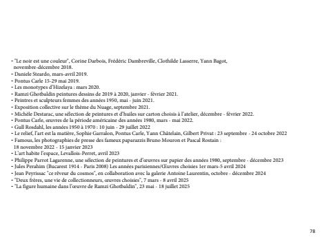 - \novembre-d%u00e9cembre 2018.- Daniele Steardo, mars-avril 2019.- Pontus Carle 15-29 mai 2019.- Les monotypes d%u2019Hizelaya : mars 2020.- Ramzi Ghotbaldin peintures dessins de 2019 %u00e0 2020, janvier - f%u00e9vrier 2021.- Peintres et sculpteurs femmes des ann%u00e9es 1950, mai - juin 2021.- Exposition collective sur le th%u00e8me du Nuage, septembre 2021.- Mich%u00e8le Destarac, une s%u00e9lection de peintures et d%u2019huiles sur carton choisis %u00e0 l%u2019atelier, d%u00e9cembre - f%u00e9vrier 2022.- Pontus Carle, %u0153uvres de la p%u00e9riode am%u00e9ricaine des ann%u00e9es 1980, mars - mai 2022.- Gull Rosdahl, les ann%u00e9es 1950 %u00e0 1970 : 10 juin - 29 juillet 2022- Le relief, l%u2019art est la mati%u00e8re, Sophie Garralon, Pontus Carle, Yann Ch%u00e2telain, Gilbert Privat : 23 septembre - 24 octobre 2022- Famous, les photographies de presse des fameux paparazzis Bruno Mouron et Pascal Rostain :18 novembre 2022 - 15 janvier 2023- L%u2019art habite l%u2019espace, Levallois-Perret, avril 2023- Philippe Parrot Lagarenne, une s%u00e9lection de peintures et d%u2019%u0153uvres sur papier des ann%u00e9es 1980, septembre - d%u00e9cembre 2023- Jules Perahim (Bucarest 1914 - Paris 2008) Les ann%u00e9es parisiennes/%u0152uvres choisies 1er mars-5 avril 2024- Jean Peyrissac \d%u00e9cembre 2024- \- \78